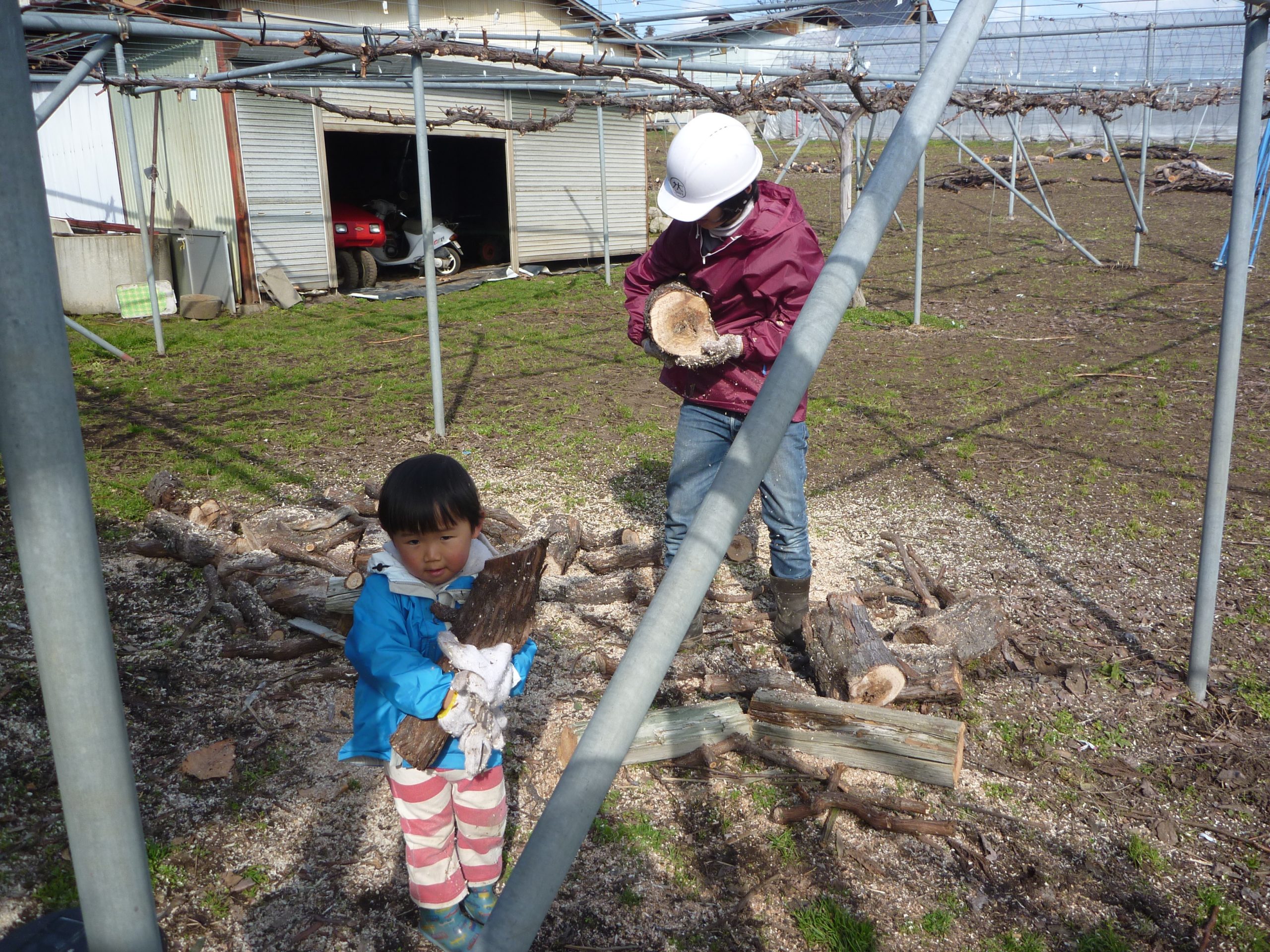 場所は自然豊かな環境~「なめこ農園」です。きのこの種類は、なめこ、しいたけです。写真は3月下旬頃の駒打ち風景。